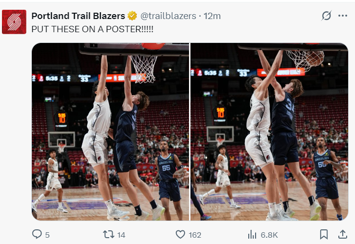 开拓者官方晒出约基奇海报与杨瀚森入场照的对比图。