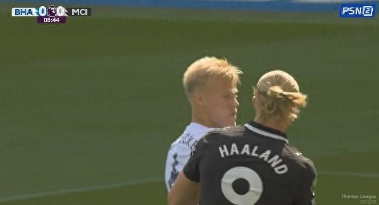 直播吧08月31日讯 曼城vs布莱顿第9分钟,哈兰德单刀力量太小被没收!随后回头和跟防的范赫克顶牛!